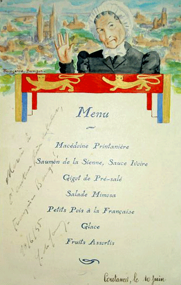 of Françoise Bangor : After a walk through the ruins and the meal at Coutances Town Hall, at it happened was not too badly damaged. I believe it was the Mayor, at that moment Monsieur Troude, a friend of the family thought of Maman to design the menus. Teacher told me that i had to go to Granville where we had a small apartment to ask Maman if she was able to carry out the work. I can still see myself arriving at Granville and telling Maman "I have good news that will bring you fame and fortune (fame, possibly but not fortune). She drew menus which i then had to paint. I enjoyed doing this. She then decided to draw a special menu for General de Gaulle himself. General de Gaulle, who was not too free with his signature signed the menu and asked the Mayor to return it to the artist. More than a few people were rather envious and there was quite a queue of people to see the signed menu. You can imagine how proud I was at the age of fourteen !" Remarks made to one of her daughters |